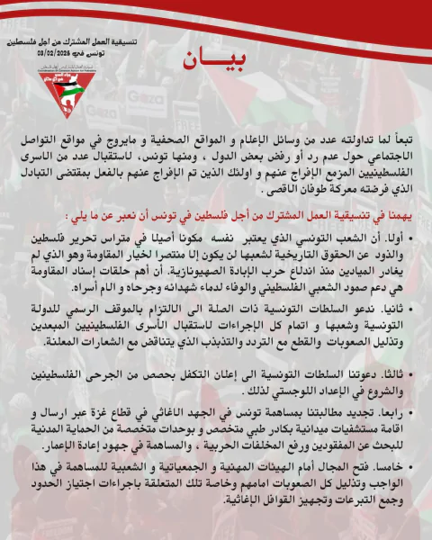 دعت تنسيقية العمل المشترك من أجل فلسطين السلطات التونسية الى الالتزام بالموقف الرسمي للدولة التونسية وشعبها وإتمام كل الإجراءات لاستقبال الأسرى الفلسطينيين المبعدين والقطع مع التردد المتناقض مع الشعارات المعلنة.