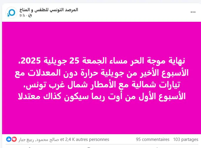 من المنتظر تسجيل نهاية موجة الحر مساء الجمعة 25 جويلية 2025، ليكون الأسبوع الأخير من جويلية بحرارة دون المعدلات مع تيارات شمالية مع الأمطار شمال غرب تونس، وفق ذات المصدر