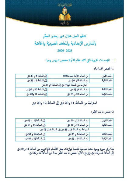 وطنية: توقيت الدروس بالمدارس الإعدادية و المعاهد الثانوية خلال شهر رمضان الكريم على النحو التالي: قراءة المزيد نشرت وزارة التربية، توقيت الدروس بالمدارس الإعدادية و المعاهد الثانوية خلال شهر رمضان الكريم وتمتد الحصة الصباحية من الساعة الثامنة صباحا إلى الساعة 11:20 دق. أما الحصة المسائية (حصة ما بعد الظهر)، فتكون من الساعة 12:20 دق إلى الساعة 15:40 دق.نقابة ديوان التونسيين بالخارج تطالب بفتح تحقيق فوري..تذاكر مباراة الترجي والملعب التونسيكأس الكاف/ نتائج قرعة الدور الربع النهائيالمزيد من الأخبار وفيما يلي تفاصيل توقيت الحصص: