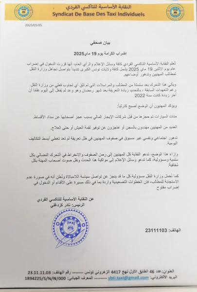 أعلنت النقابة الأساسية للتاكسي الفردي دخول منظوريها في اضراب عن العمل يوم الاثنين 19 ماي الجاري بولايات تونس الكبرى تنديدا بما اعتبرته تجاهل وزارة النقل لمطالب المهنيين وتدهور أوضاعهم.