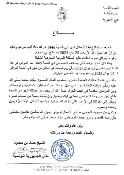 أعلن سماحة مفتي الجمهورية التونسية فضيلة الشيخ هشام محمد المختار بن محمود في بلاغ صادر عن ديوان الإفتاء مساء اليوم أن غدا 28 ماي 2025 هو الموافق لمستهل شهر ذي الحجة من العام 1446 هجري و عليه فإن