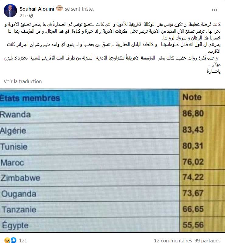 وقال العلويني في تدوينة على صفحته بفايسبوك “كانت فرصة عظيمة أن تكون تونس مقرا للوكالة الأفريقية للأدوية والتي كانت ستضع تونس في الصدارةً في ما يخص تصنيع الأدوية.