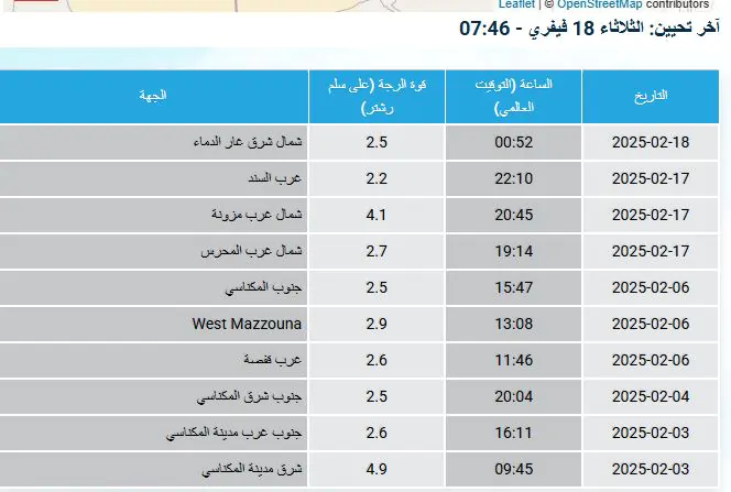 وطنية: اعلن المعهد الوطني للرصد الجوي عن تسجيل 4 هزات أرضية في تونس خلال الليلة الفاصلة بين الاثنين والثلاثاء 17 و18 فيفري 2025.