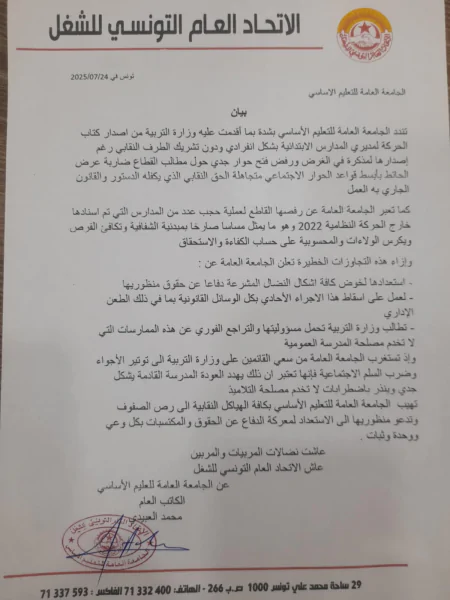 وطنية: نددت الجامعة العامة للتعليم الأساسي بإصدار وزارة التربية كتاب الحركة لمديري المدارس الإبتدائية بشكل انفرادي دون تشريك الطرف النقابي رغم إصدارها لمذكرة في الغرض ورفضها فتح حوار جدي حول مطالب القطاع، وفق ما ورد في بيانها اليوم الجمعة 25 جويلية 2025.