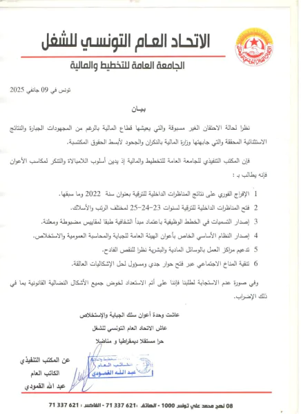 و أدان المكتب التنفيذي للجامعة العامة للتخطيط والمالية ، “أسلوب اللامبالاة والتنكر لمكاسب الأعوان” مطالبا “بالإفراج الفوري على نتائج المناظرات الداخلية للترقية بعنوان سنة 2022 وما سبقها وفتح المناظرات الداخلية للترقية لسنوات 23-24-25 لمختلف الرتب والأسلاك وإصدار التسميات في الخطط الوظيفية باعتماد مبدأ الشفافية طبقا لمقاييس مضبوطة ومعلنة”. كما تمت المطالبة “بإصدار النظام الأساسي الخاص بأعوان الهيئة العامة للجباية والمحاسبة العمومية والاستخلاص و تدعيم مراكز العمل بالوسائل المادية والبشرية نظرا للنقص الفادح و تنقية المناخ الاجتماعي عبر فتح حوار جدي ومسؤول لحل الإشكاليات العالق”ة.