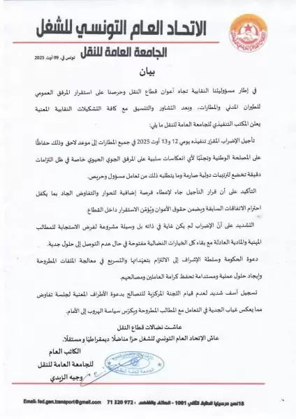أعلنت جامعة النقل التابعة للاتحاد العام التونسي للشغل، في بيان اليوم السبت، تأجيل الإضراب الذي كان من المقرر تنفيذه يومي 12 و13 أوت الجاري في جميع المطارات، إلى موعد لاحق.