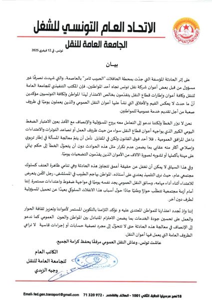 أعرب المكتب التنفيذي للجامعة العامة للنقل وكافة أعوان وإطارات قطاع النقل عن خالص الاعتذار للمواطن المعتدى عليه ولكافة التونسيين