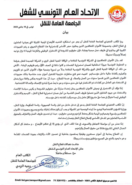 دعا المكتب التنفيذي للجامعة العامة للنقل اليوم الجمعة 10 جانفي 2O25; في بيان له إلى "تدخل عاجل من قبل رئاسة الجمهورية و رئاسة الحكومة، وزارة النقل ووزارة الشؤون الاجتماعية لوضع حد للتشغيل الهش في القطاع
