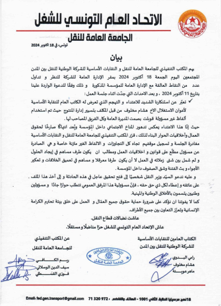 اعلنت الجامعة العام للنقل اليوم الجمعة 18 اكتوبر 2024 عن “استنكارها الشديد للاعتداء والتهجم الذي قالت ان الكاتب العام للنقابة الاساسية لاعوان الاستغلال هشام مخلوف تعرض له من قبل المكلف بتسيير إدارة المنتوج خلال جلسة عمل انعقدت اليوم بمقر الادارة العامة للشركة الوطنية للنقل بين المدن “متهمة الاخير “باستعمال الفاظ غير مسؤولة قوبلت بصمت المديرة العامة وكل الفريق المصاحب لها”.