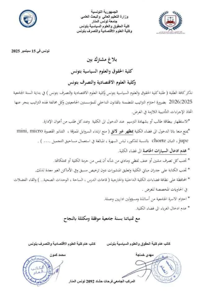 وجّهت كليتا الحقوق والعلوم السياسية، والتصرف والعلوم الاقتصادية بجامعة تونس المنار، بلاغًا إلى طلبتهما يتضمّن جملة من التراتيب الداخلية التي يتعيّن الالتزام بها داخل الحرم الجامعي.