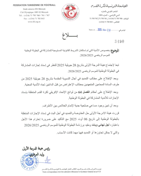 رياضة: أعلنت الجامعة التونسية لكرة القدم في بلاغ صادر اليوم الإثنين 28 جويلية 2025، أنه وفي أعقاب اجتماع هيئة الدرجة الأولى المخصص للنظر في ملفات إسناد إجازات المشاركة في البطولة الوطنية للموسم الرياضي 2025-2026، تقرر التمديد في أجل البت النهائي في الملفات العالقة إلى غاية يوم 06 أوت 2025.
