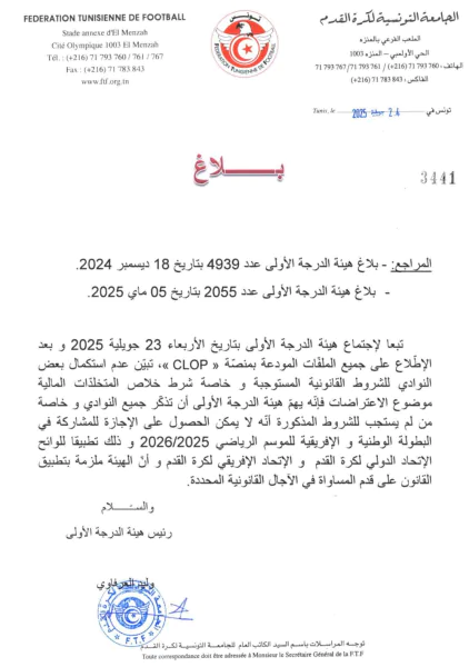 وقالت الجامعة ان المشاركة في البطولة الوطنية والإفريقية للموسم 2025/2026 تظل مشروطة باحترام اللوائح الصادرة عن الفيفا والكاف، وأن الهيئة ستُطبّق القانون على جميع الأندية دون استثناء وفي إطار الآجال القانونية.
