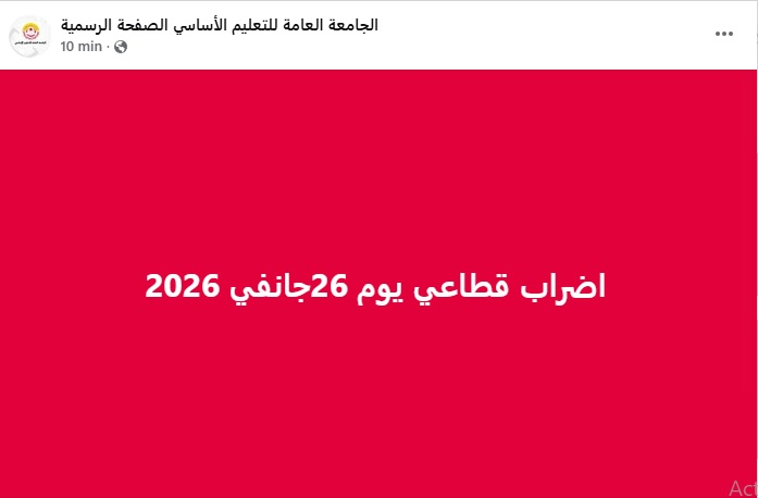 وطنية: أقرّت الهيئة الإدارية لقطاع التعليم الأساسي، المنعقدة اليوم الثلاثاء 18 نوفمبر 2025 بمقر الاتحاد العام التونسي للشغل، إضرابا قطاعيا يوم 26 جانفي 2026، وفق ما أعلنته الصفحة الرسمية للجامعة العامة للتعليم الأساسي