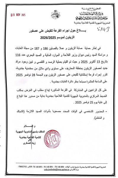 اعلنت المندوبية الجهوية للفلاحة بجندوبة انه تقرر اجراء قرعة استثنائية للقبض على عصفور الزيتون يوم الجمعة 28 نوفمبر 2025