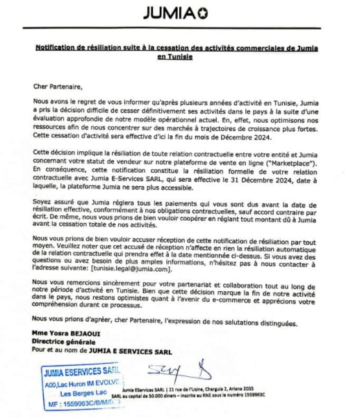 أعلن الرئيس التنفيذي لـجوميا ''فرانسيس دوفاي''، إنّ شركة التجزئة الإفريقية عبر الإنترنت ''جوميا تكنولوجيز'' ستغلق متجر بيع الأزياء بالتجزئة عبر الإنترنت وعملياتها في تونس وجنوب إفريقيا بحلول نهاية العام من أجل التركيز على أسواقها الأخرى.
