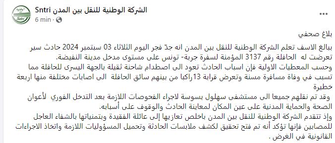 وطنية: أعلنت الشركة الوطنية للنقل بين المدن وفاة مسافرة مسنة في حادث السير، الذي جدّ فجر اليوم الثلاثاء 03 سبتمبر 2024، وتعرضت له الحافلة المؤمنة لسفرة جربة- تونس على مستوى مدخل مدينة النفيضة.