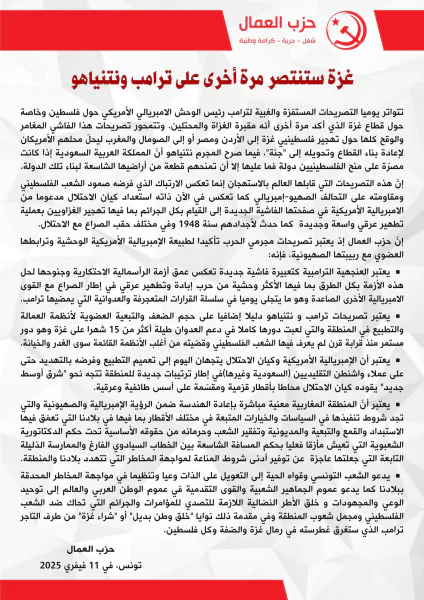 نشر حزب العمال اليوم الثلاثاء 11 فيفري 2025 ، بيانا حول التصريحات الاخيرة والمتتالية للرئيس الأمريكي دونالد ترامب .