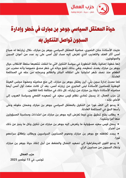 سياسة: دعا حزب العمال "إلى الكفّ فورا عن التنكيل بالمعتقل السياسي جوهر بن مبارك وضمان حقوقه وعلى رأسها الحق في المحاكمة العادلة"