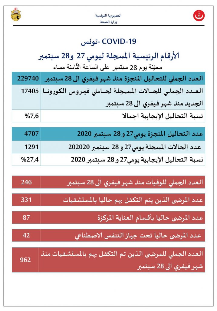 أعلنت وزارة الصحة في بلاغ لها اليوم الثلاثاء عن حصيلة الإصابات بفيروس كورونا ليومي 27 و 28 سبتمبر و التي بلغت 1291 إصابة من جملة 4707 تحليلا منجزا ليرتفع العدد الإجمالي للمصابين إلى 17405.