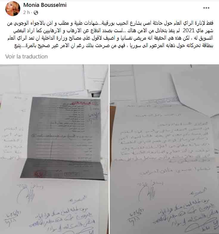 وأيّدت المحامية في تدوينة لها على صفحتها الرسمية بموقع التواصل فايسبوك، ببعض الوثائق التي تثبت صحّة روايتها وقالت ”فقط لإنارة الرأي العام حول حادثة أمس بشارع الحبيب بورقيبة…شهادات طبية ومطلب وإذن بالإيواء الوجوبي منذ شهر ماي 2021 لم ينفذ بتخاذل من الأمن هناك”.
