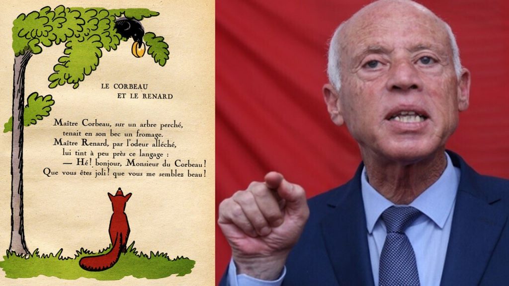 روى قيس سعيد أن رئيسا افريقيا نزل ضيفا بقصر قرطاج وكان في استقباله رفقة الوزير الأول ..ساعتها توجه بورقية للرئيس الافريقي بالسؤال إن كان يحفظ Fables de La Fontaine Les فأجابه بنعم، فقال له ترى من منا هو الغراب ؟ انفعل الرئيس الإفريقي لكن بورقيبة سرعان ما هدأ من روعه قائلا: أقصد أيا منا أنا أم الوزير الأول؟