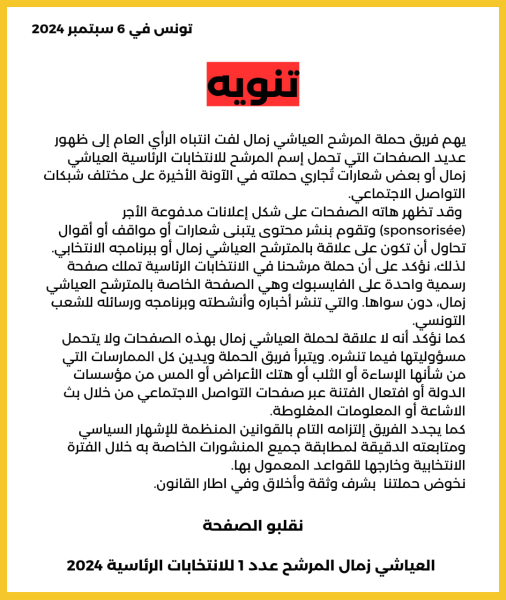 اعلنفريق حملة المترشح للانتخابات الرئاسية العياشي زمال عن” ظهور عديد الصفحات التي تحمل إسم المرشح للانتخابات الرئاسية العياشي زمال أو بعض شعارات تُجاري حملته في الآونة الأخيرة على مختلف شبكات التواصل الاجتماعي وقد تظهر هاته الصفحات على شكل إعلانات مدفوعة الأجر (sponsorisée) وتقوم بنشر محتوى يتبنى شعارات أو مواقف أو أقوال تحاول أن تكون على علاقة بالمترشح العياشي زمال أو ببرنامجه الانتخابي” ، معلنا تبرأه من هذه الصفحات.