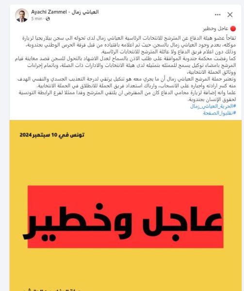 واعتبرت “حملة العياشي زمال أن ما يجري معه هو تنكيل يرتقي لدرجة التعذيب الجسدي والنفسي الهدف منه كسر ارادته واجباره على الانسحاب، وارباك استعداد فريق الحملة للانطلاق في الحملة الانتخابية ، “مشيرة الى انه “إضافة لزيارة محامي الدفاع كان من المفترض ان يلتقي المترشح وفدا ممثلا لفرع الرابطة التونسية لحقوق الإنسان بجندوبة”.