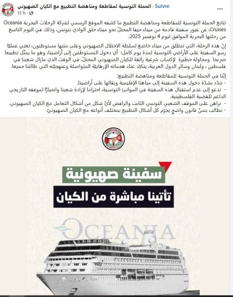 وطنية: أعلنت الحملة التونسية للمقاطعة ومناهضة التطبيع أنها تتابع بقلق ما كشفه الموقع الرسمي لشركة الرحلات البحرية Oceania Cruises بشأن عبور سفينة قادمة من ميناء حيفا المحتل نحو ميناء حلق الوادي يوم 4 نوفمبر 2025، في إطار رحلتها البحرية.