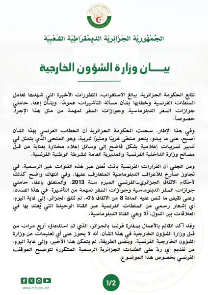 واردفت “اليوم، كما الأمس لا ترى الجزائر في هذا الاتفاق أي مصلحة خاصة ولا تبدي أن تعلقٍ محدد بشأنه… الجزائر تسجّل على الوجه الواجب ما يُعد بمثابة تعليق فعلي لاتفاق سنة 2013 من قبل الطرف الفرنسي، دون احترام هذا الأخير للإجراءات القانونية المتوخاة… كما أنها تستخلص ما يترتب عن هذا التوجه من تبعات وسترد عليه من خلال تطبيق دقيق وصارم لمبدأ المعاملة بالمثل بما يعادل مقدار إخلال الطرف الفرنسي بالتزاماته وتعهداته”
