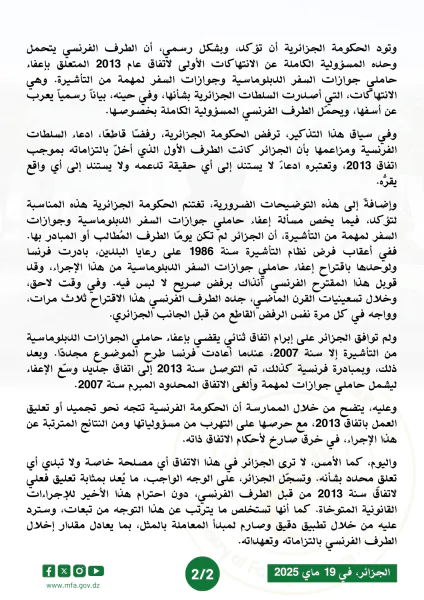 واكدت الحكومة الجزائرية ” أن الطرف الفرنسي يتحمل وحده المسؤولية الكاملة عن الانتهاكات الأولى لاتفاق عام 2013 المتعلق بإعفاء حاملي جوازات السفر الدبلوماسية وجوازات السفر لمهمة من التأشيرة وهي الانتهاكات التي أصدرت السلطات الجزائرية بشأنها وفي حينه بياناً رسمياً يعرب عن أسفها ويحمّل الطرف الفرنسي المسؤولية الكاملة بخصوصها”