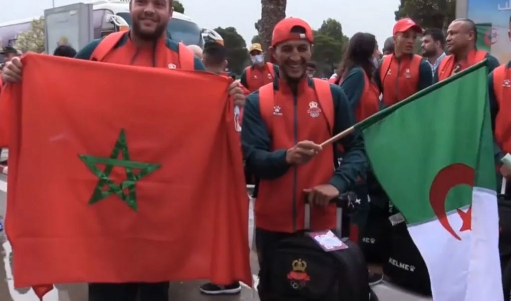 ورد بعض عناصر الوفد المغربي من الرياضيين، بعباراة “وان تو ثري فيفا لالجيري”.