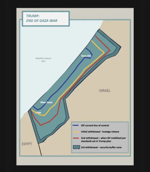 كما لفت إلى أن الخط الثاني الأصفر يوضح المرحلة الأولى من المبادرة، والتي يتوقع أن ينسحب منها الجيش الإسرائيلي، وتمتد من شمال غزة حتى مشارف رفح، كما ستكون مرتبطة ومتزامنة مع الإفراج عن الرهائن والجثامين.