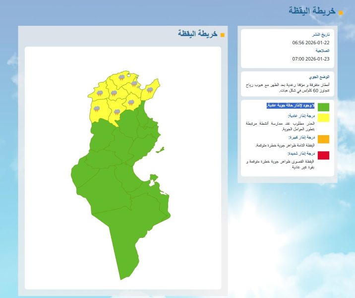 بعد أيام من الأمطار الغزيرة وارتفاع منسوب المياه والسيول في مختلف مناطق البلاد، يشهد الطقس في تونس اليوم الخميس 22 جانفي 2025 حالة من الاستقرار النسبي. وتوضح خريطة اليقظة الصادرة عن المعهد الوطني للرصد الجوي خلوّ البلاد من اللونيْن الأحمر والبرتقالي، اللذين يشيران إلى درجتي الإنذار الشديد والكبير، بينما تمّ تخصيص اللون الأصفر، وهو درجة إنذار عادية، لولايات تونس الكبرى، نابل، زغوان، بنزرت، باجة، جندوبة، الكاف وسليانة، فيما بقيت بقية الولايات باللون الأخضر، ما يعكس عدم وجود أي إنذار جوّي خاص.