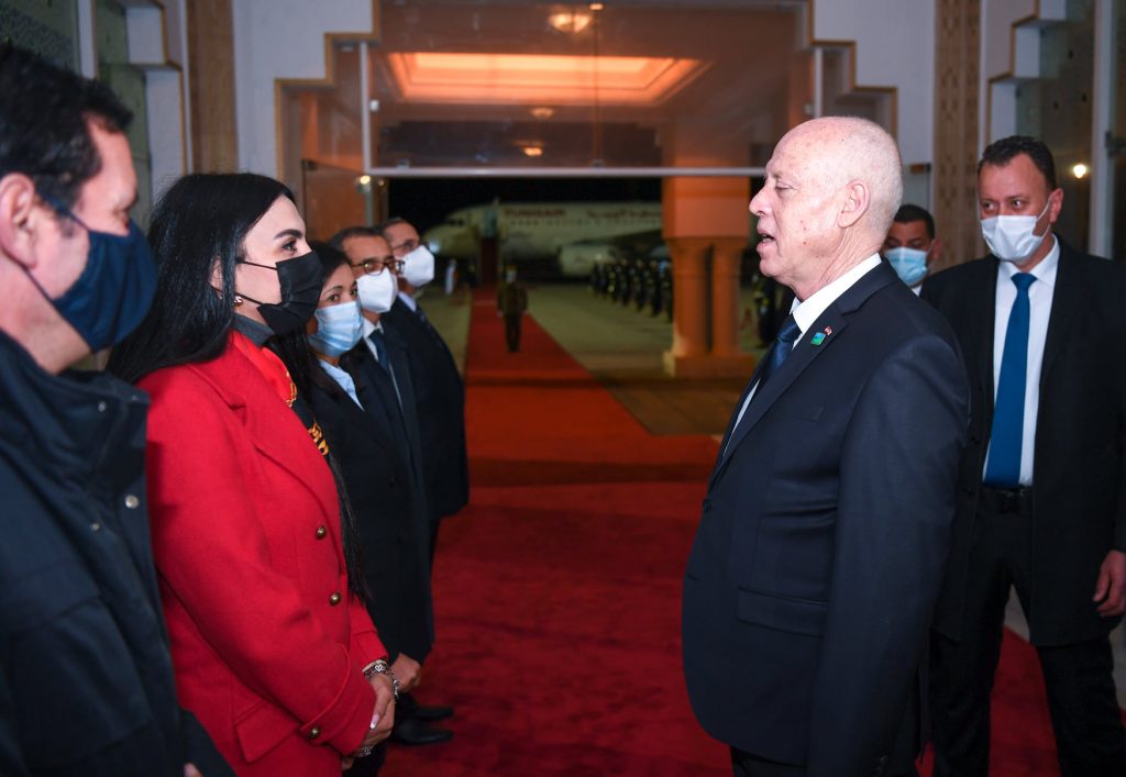وكان في استقبال رئيس الجمهورية نجلاء بودن رمضان، رئيسة الحكومة، وكمال الفقي، والي تونس، وسعاد عبد الرحيم، رئيسة بلدية تونس، وعدد من أعضاء الديوان الرئاسي.