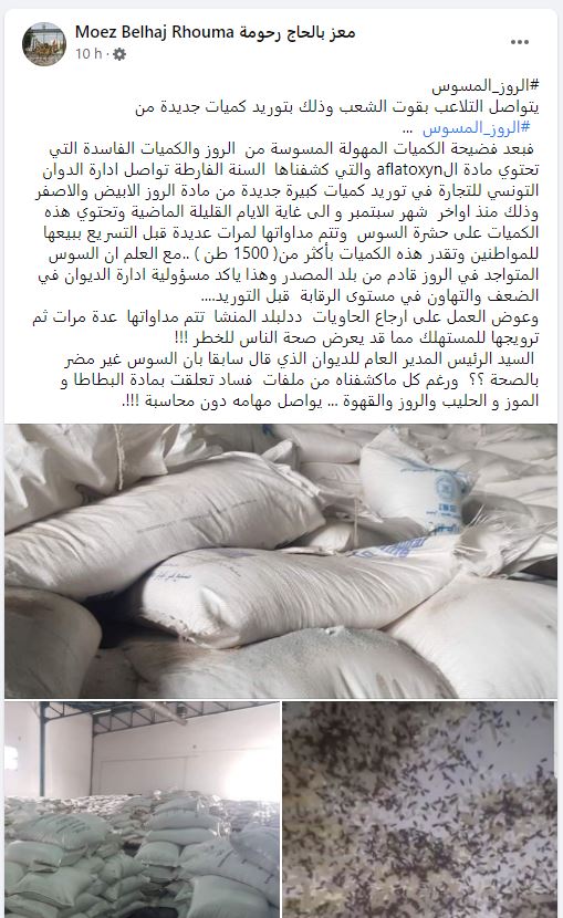 وأضاف رحومة في تدوينة على حسابه الرسمي بموقع التواصل الاجتماعي الفايسبوك، “حسب المعلومات المؤكدة لدينا تقدر هذه الكميات بأكثر من (1500 طن) تم قبولها مسوسة من بلد المصدر وهي في الحاويات وعوض العمل على ارجاعها يتم مداواتها عدة مرات وبيعها للمستهلك مما قد يعرض صحة الناس للخطر!”.