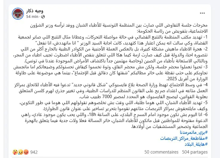 وطنية: أكد وجيه ذكار رئيس المنظمة التّونسية للأطباء الشبان، أن الجلسة التفاوضية، التي جمعت مساء أمس الإثنين ممثيلن عن المنظمة ووفد تفاوض عن وزارة الصحة بحضور وزير الشؤون الإجتماعية، أدت إلى مزيد تعقيد الوضعية حيث شهدت تهديدا ضمنيا من وزير الشؤون الاجتماعية عصام الأحمر للأطباء الشبان في صورة مواصلة مقاطعة عملهم عبر اثارة تتبعات قضائية ضدهم وفق قوله