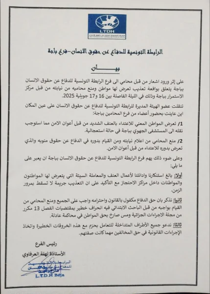 أعربت الرابطة التونسية للدفاع عن حقوق الإنسان فرع باجة عن استنكارها لتعرض مواطن إلى التعذيب ومنع محاميه من نيابته من قبل مركز الاستمرار بباجة في الليلة الفاصلة بين 16 و17 جويلية الجاري،