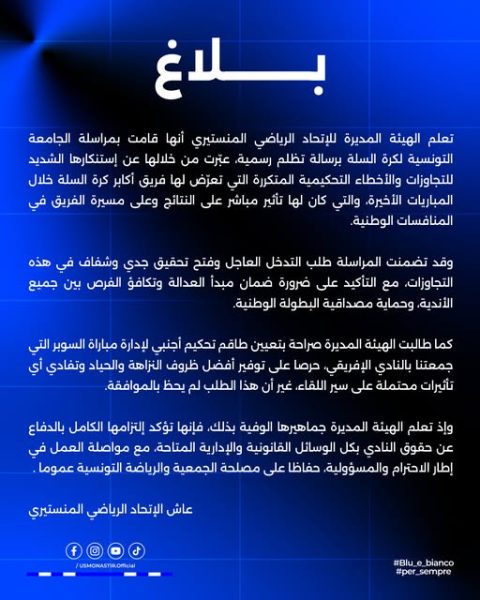 رسالة تظلّم من الاتحاد المنستيري إلى جامعة كرة السلة