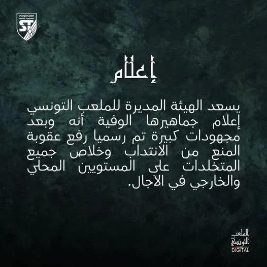 رياضة: أعلن الملعب التونسي في بلاغ له على صفحته الرسمية أنه وبعد مجهودات كبيرة تمكن من رفع عقوبة المنع من الإنتداب وخلاص جميع المتخلدات على المستويين المحلي والخارجي في الاجال.