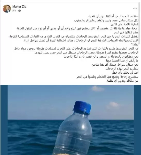 زيد أكد وجود تيارات بحرية وسطحية قوية من شأنها أن تحمل الزجاجات من الغرب إلى الشرق تحديدا سواحل القطاع وفق تقديره.