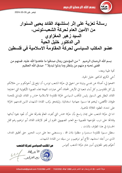 كما نشرت الحركة رسالة تعزية من امينها العام زهير المغزاوي الى خليل الحية عضو المكتب السياسي لحركة حماس جاء فيها بالخصوص:” اسمحوا لي اصالة عن نفسي ونيابة عن اخوتي في حركة الشعب ان ارفع الى اخوتكم ومن خلالكم الى كل المقاومين وكل ابناء شعبنا في الارض المحتلة اسمى عبارات التهنئة بهذه الصورة الايقونية التي اختار القائد البطل يحيى السنوار رئيس المكتب السياسي لحركة المقاومة الاسلامية حماس والقائد الميداني لملحمة طوفان الاقصى ان يختم بها مسيرة جهادية استثنائية وليلتحق بركب القادة الشهداء الذين قدمتهم الحركة على امتداد العقود الثلاثة الماضية “.