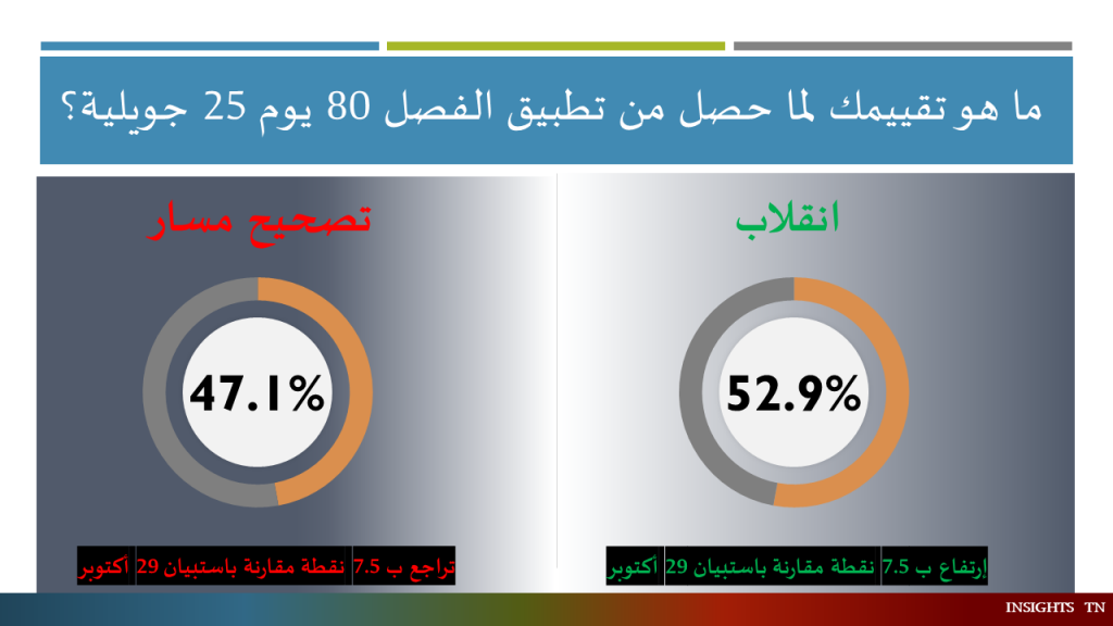 أظهرت نتائج سبر للآراء أجرته مؤسسة Insights TN أنّ 52.9 بالمائة من التونسيين يعتبرون أنّ الاجراءات التي أعلن عنها رئيس الجمهورية قيس سعيّد يوم 25 جويلية الماضي تعدّ انقلابا، علما وأن هذه النسبة ارتفعت بنسبة 7.5 بالمائة مقارنة مع استبيان أجرته المؤسسة يوم 29 أكتوبر المنقضي.