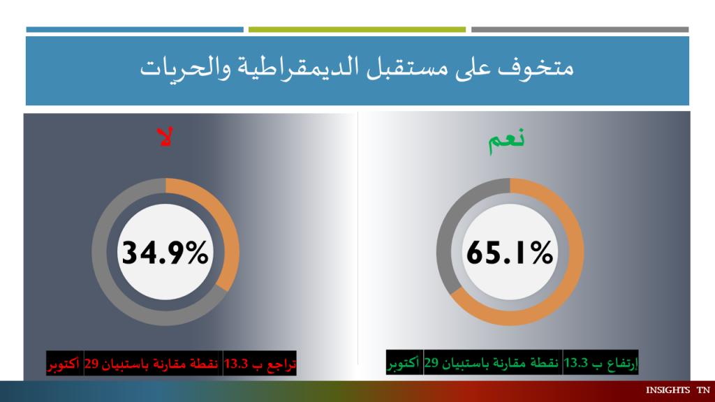 كذلك أعرب 65.1 بالمائة عن تخوّفهم على مستقبل الديمقراطية، مقابل 51.8 بالمائة فقط في سبر آراء شهر أكتوبر.