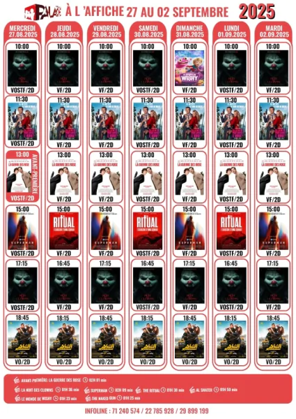 حاليا في قاعات السينما: تضع قاعة سينما البالاص على ذمة متابعي السينما التونسية والعربية والعالمية برمجة ثرية وبرنامجا متنوعا الى غاية يوم 2 سبتمبر 2025.