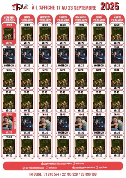 حاليا في قاعات السينما: تضع قاعة سينما البالاص على ذمة متابعي السينما التونسية والعربية والعالمية برمجة ثرية وبرنامجا متنوعا الى غاية يوم 23 سبتمبر 2025.