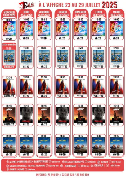 حاليا في قاعات السينما: تضع قاعة سينما البالاص على ذمة متابعي السينما التونسية والعربية والعالمية برمجة ثرية وبرنامجا متنوعا الى غاية يوم 29 جويلية 2025.
