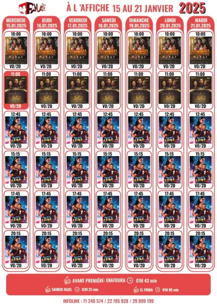 حاليا في قاعات السينما: تضع قاعة سينما البالاص على ذمة متابعي السينما التونسية والعربية والعالمية برمجة ثرية وبرنامجا متنوعا من يوم 15الى 21 جانفي 2025