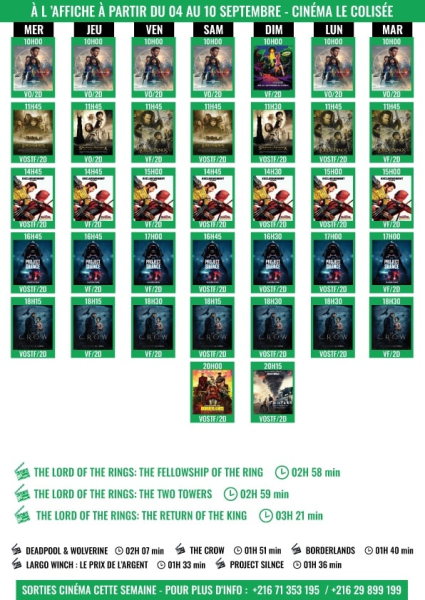 حاليا في قاعات السينما: تضع قاعة سينما الكوليزي على ذمة متابعي السينما التونسية والعالمية برنامجا متنوعا من يوم 4 الى يوم 10 سبتمبر 2024.