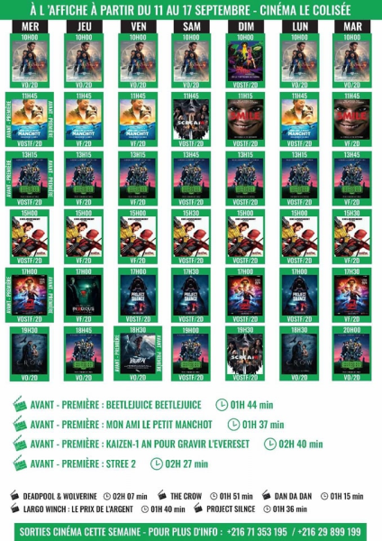 حاليا في قاعات السينما: تضع قاعة سينما الكوليزي على ذمة متابعي السينما التونسية والعالمية برنامجا متنوعا من يوم 11 الى يوم17 سبتمبر 2024.