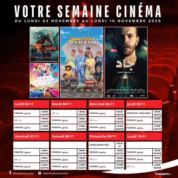 حاليا في قاعات السينما: تقدم سينما L’Alhambra زفير المرسى على ذمة متابعي السينما التونسية والعالمية برنامجا متنوعا إلى غاية 10 نوفمبر 2025.